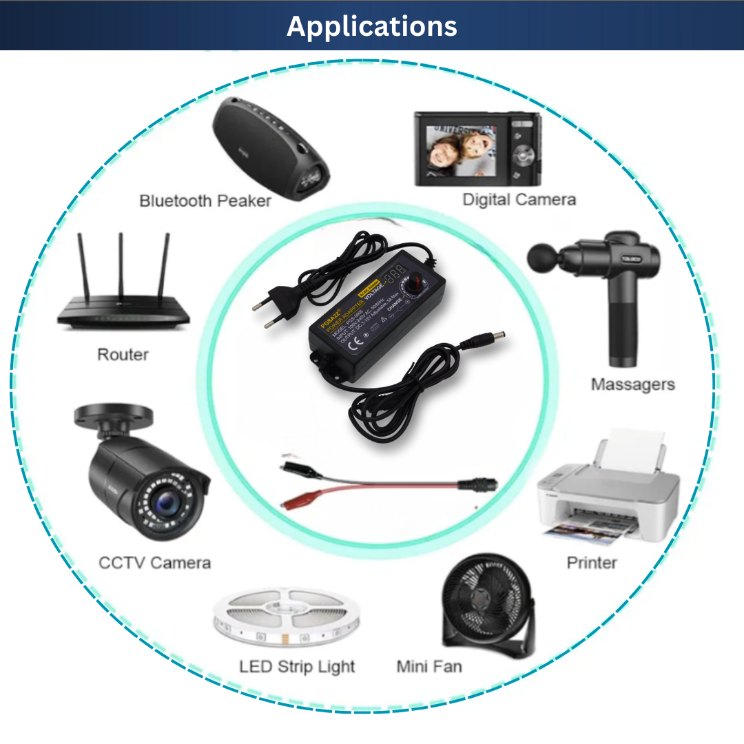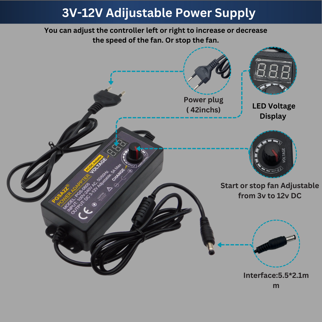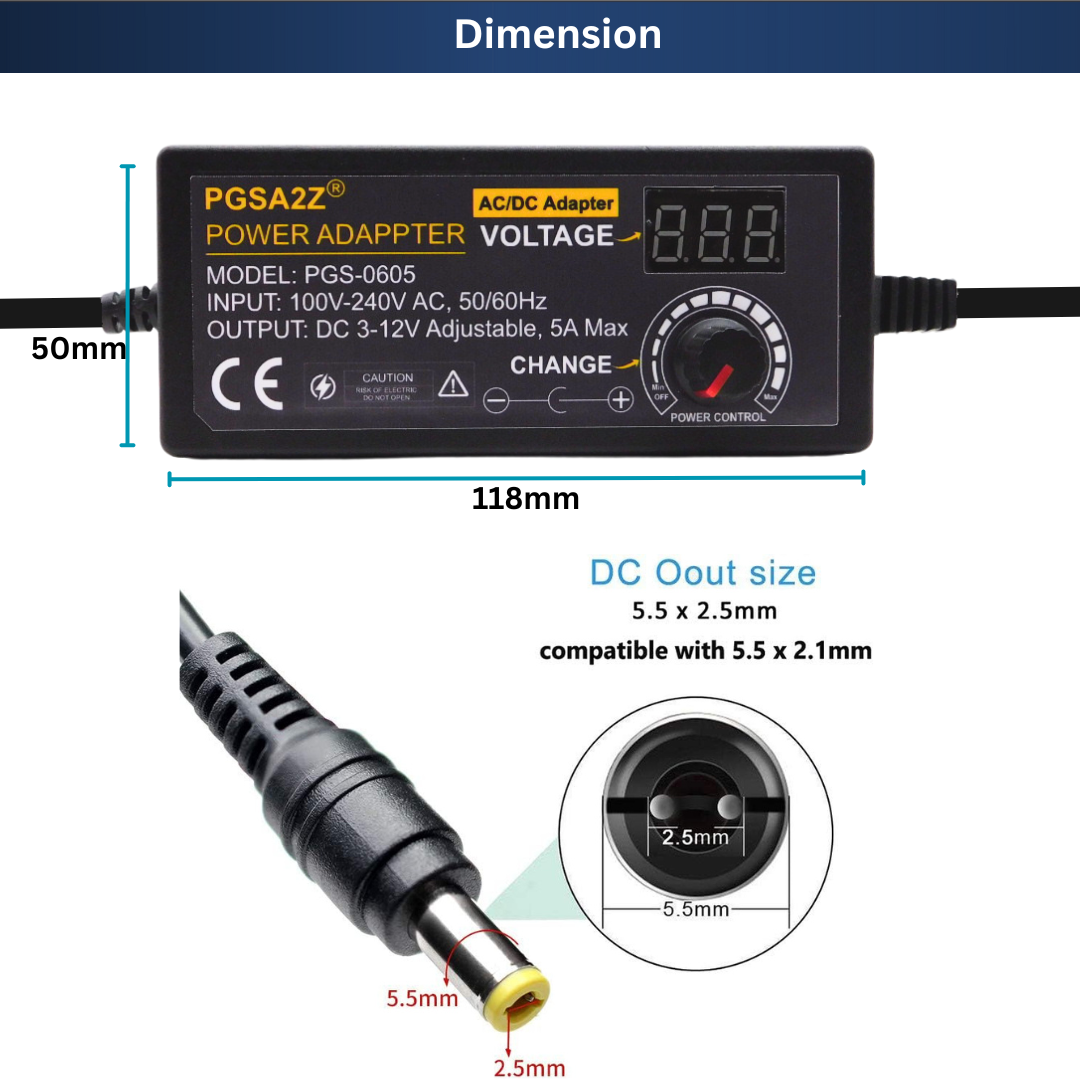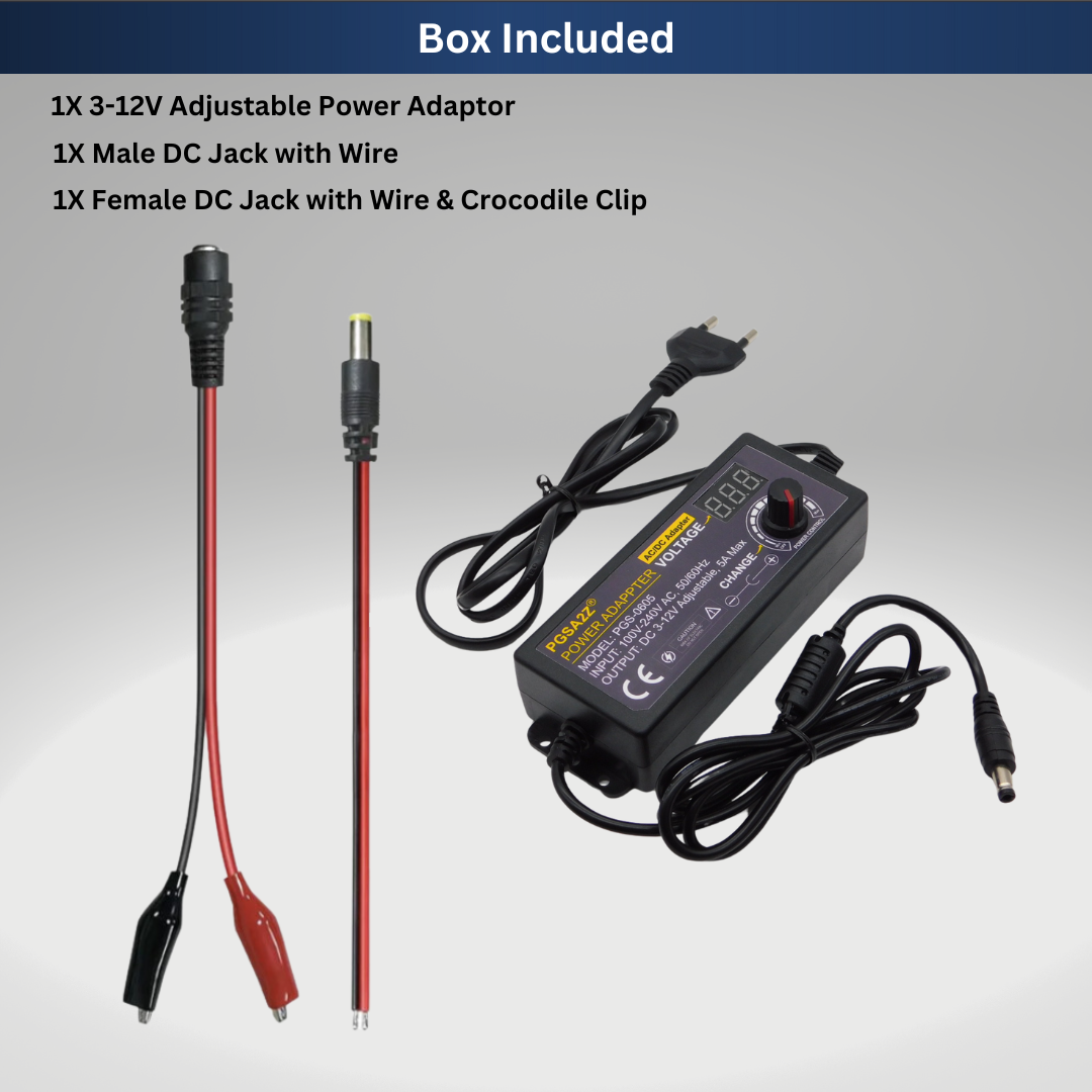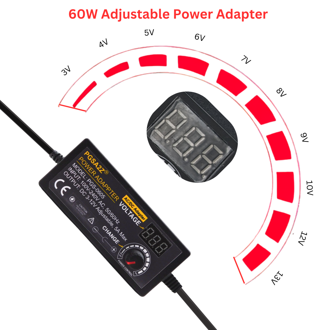 Buy 3V–12V 5A 60W adjustable power supply with LED display and universal AC input (100–240V). Ideal for LED lights, DC motors, electronics projects, and testing.
